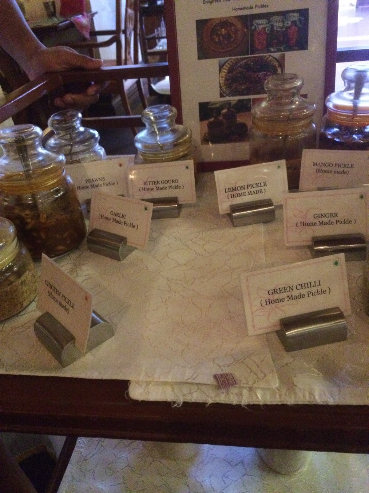 Then they wheeled in a trolley laden with various pickles. There were 9 in all and it was really tough to choose one or two, there was no way we could have tasted all 9 of them. I tried the chicken pickle and the bitter gourd pickle. Both were excellent.