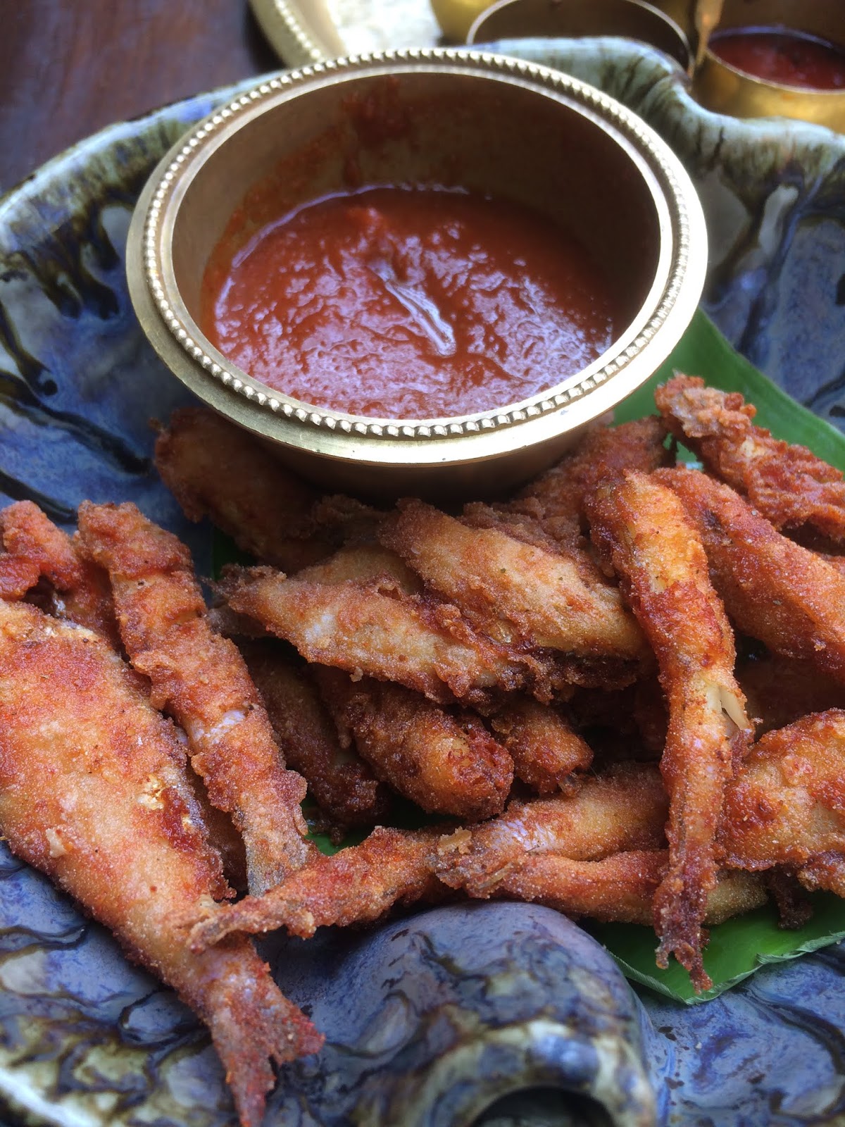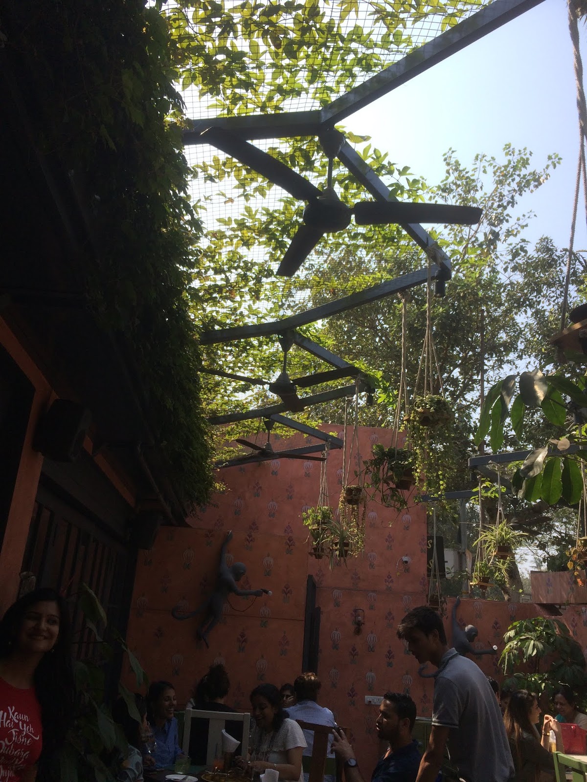 They have beautiful outdoor seating perfect for winters. There is this small courtyard of a thing which makes you feel as if you have stepped into a Rudyard Kipling book. When you enter the left corner wall has a huge old gnarled mango tree. The wall on the right side is painted a beautiful combination of burnt orange and rust – not the bright garish kind, but the dull and muted kind that has seen the passage of time and sunlight – and has small motifs drawn on it like a boundary wall of a long-forgotten temple that you may have stumbled across, complete with monkey lamps – literally monkeys holding bulbs – to complement the jungle theme. The whole courtyard is a profusion of green in various sizes, shapes and colors. There are shrubs, planters, hanging planters, creepers and trees.